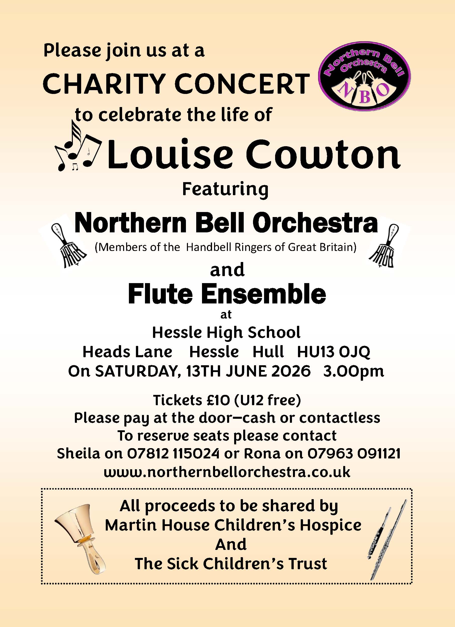 The Northern Bell Orchestra will be performing a concert in memory of member Louise Cowton in Hessle on Saturday 13th June 2026.